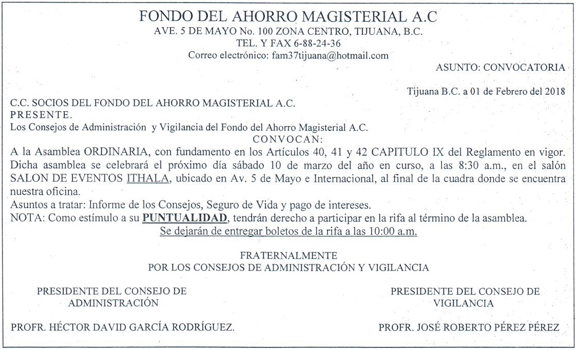 | Convocatoria | Convocatoria para Asamble Ordinaria 2018 |